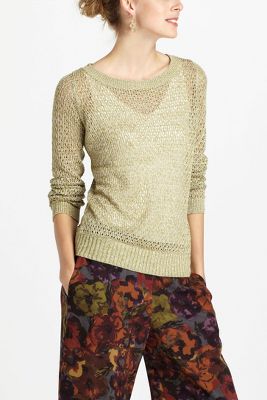 First, how fug are those pants the model is wearing??? Maybe I'm just falling behind in the fashion times, I dunno but good luck to Anthro moving those above a $10-$20 price point... I'm wearing an XS in the sweater. It is completely synthetic but hand washable so maybe not too bad if you plan on wearing it in the fall. I like the pink version but don't have green in my sweater collection so I tried this one out. It is nice and I think could be very versatile while still maintaining a semi-special quality with the metallic threads. Too bad it is too delicate to wear with a necklace; this one needs it and I wouldn't want to risk the constant snagging so passing on this one.