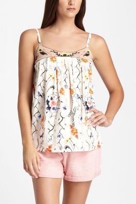 I am wearing my usual size XS here and find the fit to be true to size. This is such a pretty pattern on this lounge cami, don't ya think? Of course it is shear so if you plan on venturing out of the house I suggest layering a cami underneath. You can see just how sheer the top is by looking at the bottom. It is very comfortable, light weight, and made of my favorite fabric - cotton. I plan on picking this up if it hits sale. I like that it will work under blazers for the fall and be a great casual weekend top next summer.