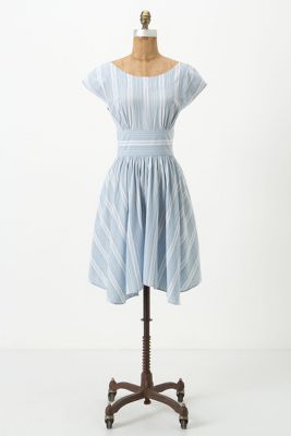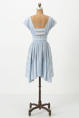 I am wearing a size 0 here because there were no size twos on the floor.  It actually fit quite nicely when on but getting this dress off caused a mild panic attack.  See in the stock picture showing the back of the dress how the zipper ends and then there are two straps?  Well, those straps don't move nor stretch so it was near impossible getting this dress off of me.  I wonder how the size two would work with this those straps and if it would be big elsewhere?  This is a great all cotton dress requiring hand washing with a very subtle uneven hem.  I really loved this dress on, the light blue color feels so light, the breathable cotton, retro neckline, stripes.  The price is nice too.  I guess that's why this dress is selling out fast.  The straps in the back make this a deal breaker for me though; I don't want to fight my clothes when I'm taking them off.